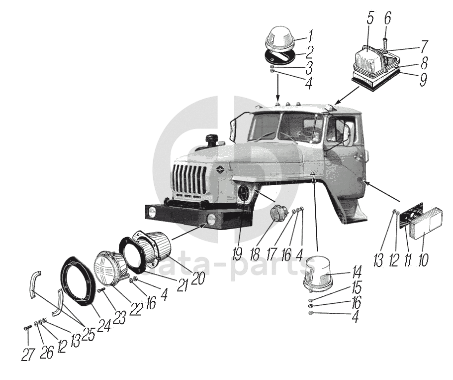 Установка фар, фонарей знака автопоезда, габаритных и указателей поворота для автомобилей Урал 4320-0001911-60, Урал 4320-0001912-60, Урал 4320-0001916-60, Урал 4320-0001922-60, Урал 4320-0001951-60, Урал 4320-0001952-60 УРАЛ-4320-60