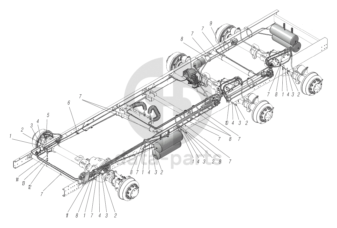 Крепление трубопроводов и шлангов пневмогидравлического привода рабочих тормозов УРАЛ-44202-3511-80