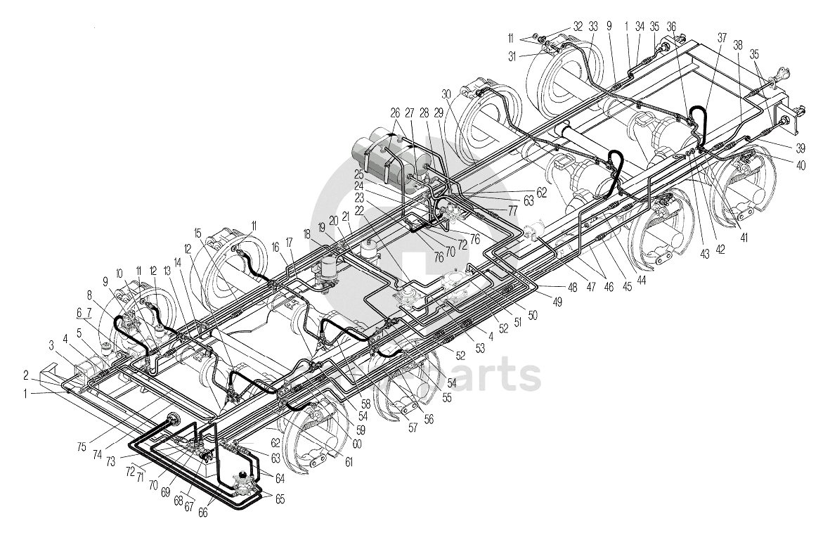 Трубопроводы и шланги гидропневматического привода рабочих тормозов для автомобилей Урал 532361 и 532362 УРАЛ-532361