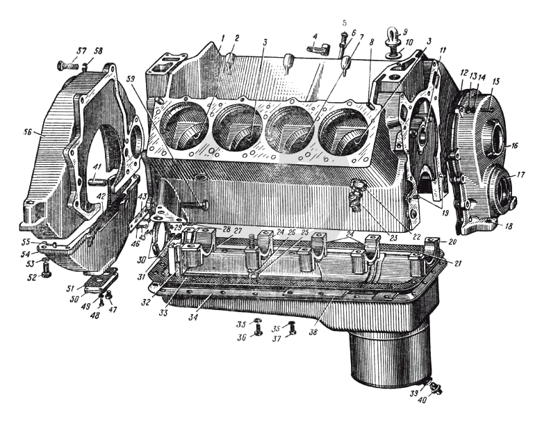 Блок цилиндров, масляный картер, крышки подшипников коленчатого вала, втулки распределительного вала, картер маховика (Рис.8)