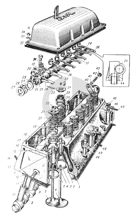 Головка блока цилиндров, клапаны и толкатели (Рис.9) УРАЛ-375