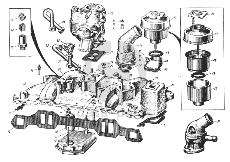 Впускная труба, вентиляция картера, установка маслоналивного патрубка и фильтра вентиляции картера, установка карбюратора выпускного патрубка водяной рубашки двигателя, термостата и датчика температуры воды (Рис.12) УРАЛ-375