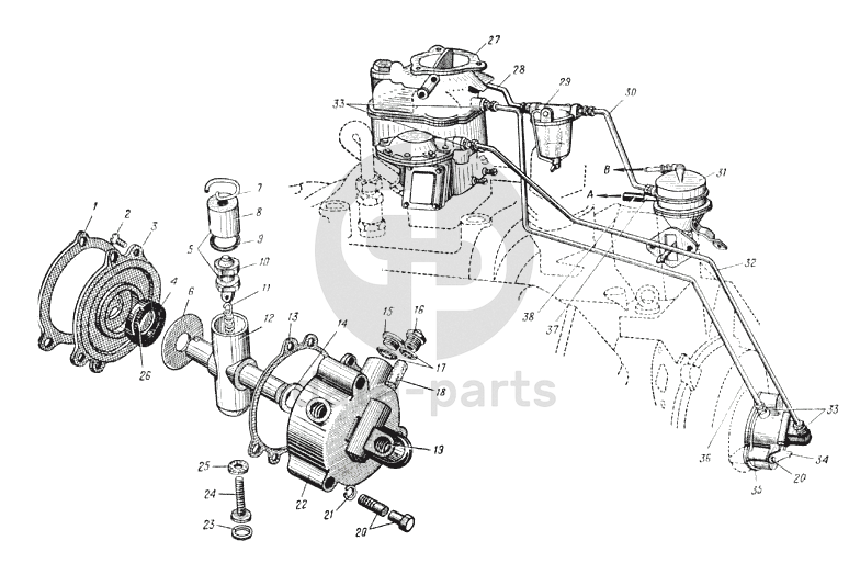 Центробежный датчик ограничителя оборотов коленчатого вала двигателя, топливопроводы карбюратора и топливного насоса (Рис. 29)