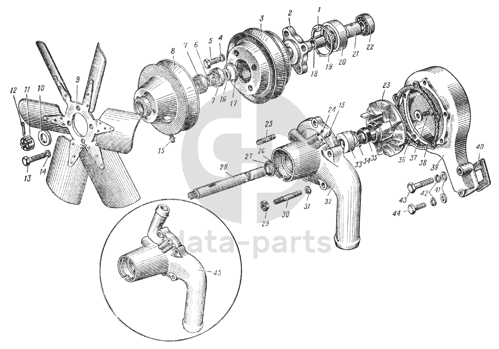 Водяной насос и вентилятор автомобиля Урал-375Д (Рис. 36) УРАЛ-375