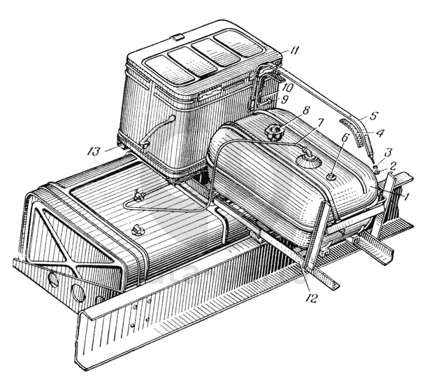 Крепление инструментального ящика и дополнительного топливного бака на основании держателя запасного колеса седельного тягача Урал-377С (Рис. 164)