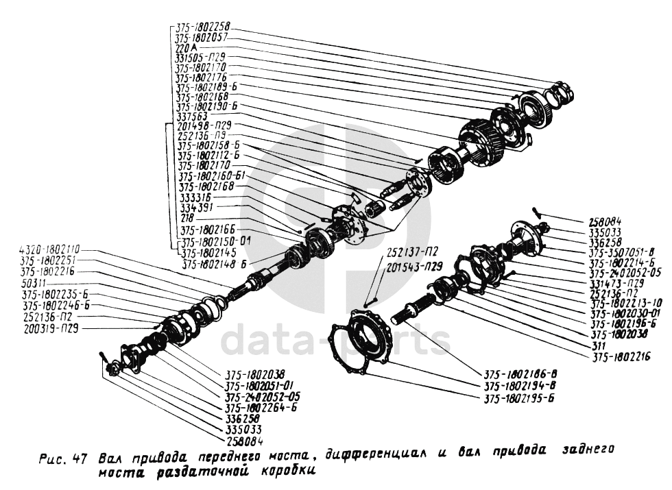 Вал привода переднего моста, дифференциал и вал заднего моста раздаточной коробки УРАЛ-4320