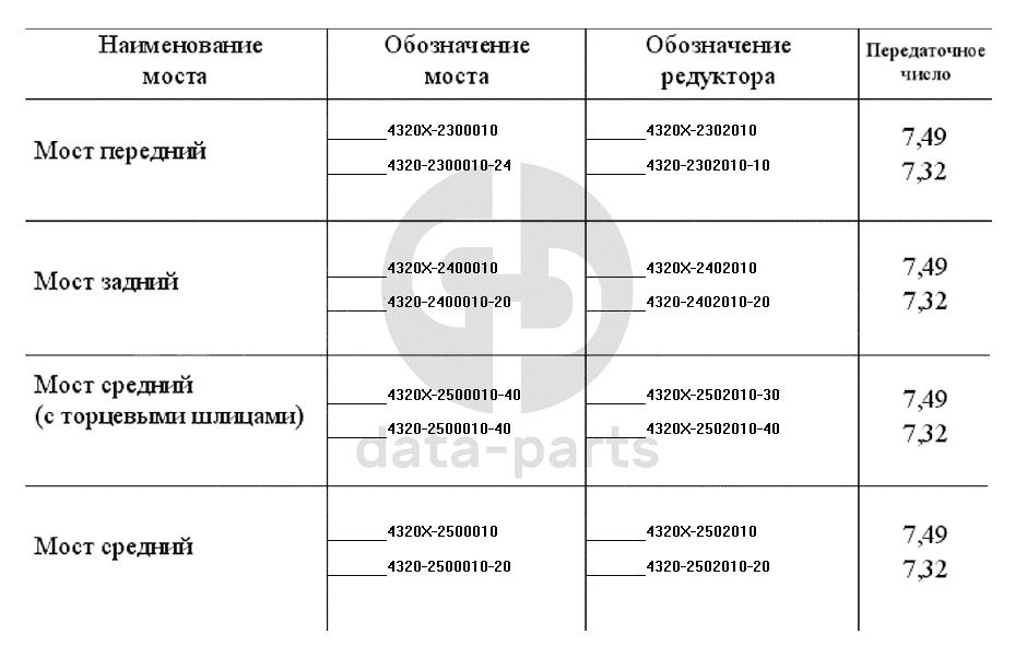 Номенклатура мостов без АБС и БМКД УРАЛ-4320-31