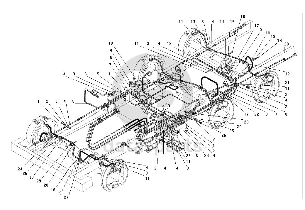 Крепление трубопроводов и шлангов пневмогидравлического привода рабочих тормозов без АБС УРАЛ-4320-41