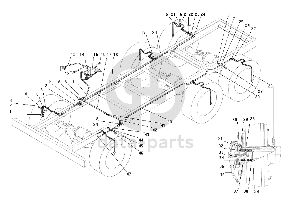 Трубка УРАЛ от тройника к среднему левому колесу в сборе