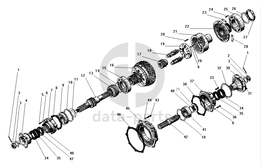 Вал привода переднего моста, дифференциал и вал привода заднего моста раздаточной коробки