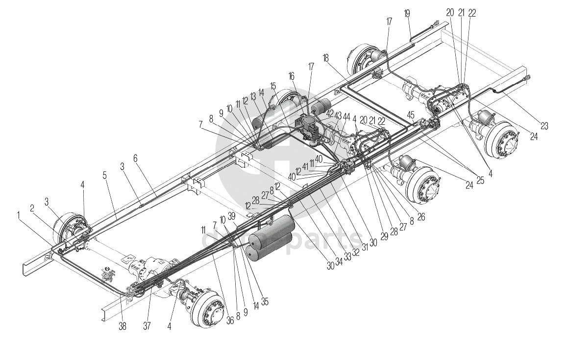 Трубопроводы и шланги пневматического привода рабочих тормозов