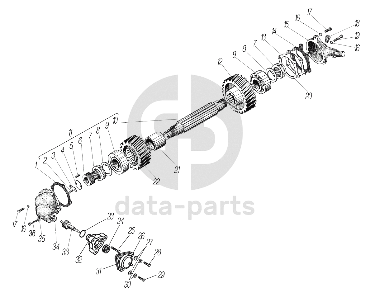 Промежуточный вал раздаточной коробки и привод спидометра УРАЛ-4320-1951-58