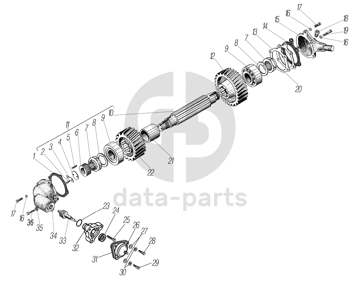 Промежуточный вал раздаточной коробки и привод спидометра УРАЛ-4320-0971-58