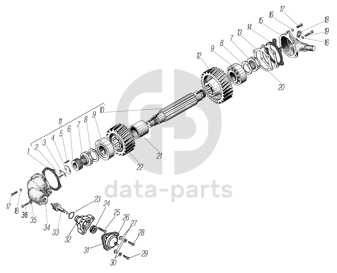 Промежуточный вал раздаточной коробки и привод спидометра УРАЛ-44202-0511-58