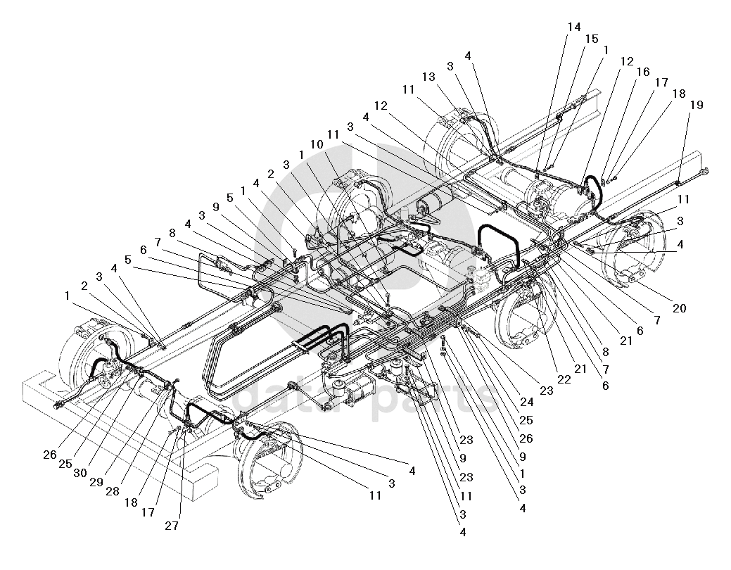 Крепление трубопроводов и шлангов гидропневматического привода рабочих тормозов без АБС УРАЛ-5557-40